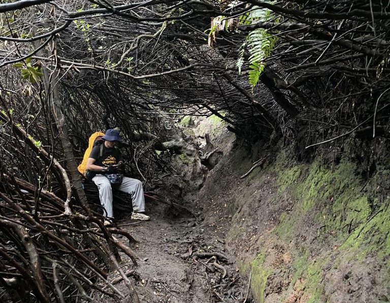 Menuju shelter 2 ini, kami disuguhkan dengan berbagai tantangan. Mulai melewati jalur air, lorong dinding tanah yang sempit, hingga trek yang terjal. Bergelayutan di akar pohon dan dinding bebatuan dengan beban bawaan di punggung seringkali tak terhindarkan.