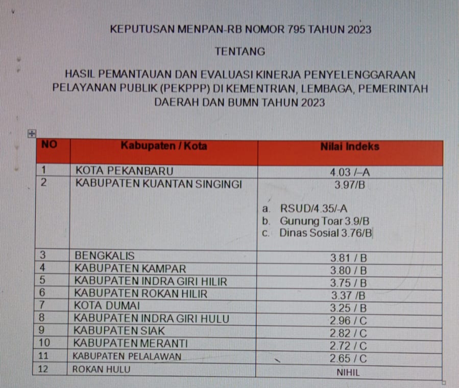 PEKANBARU, LIPO - Kemenpan RB merilis hasil Pemantauan dan Evaluasi Kinerja Penyelenggaraan Pelayanan Publik ( PEKPPP) yang yang tertuang dalam Surat Keputusan No 795 Tahun 2023,