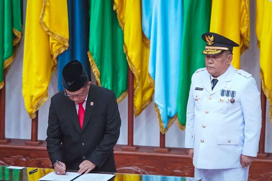 Usai dilakukan pengambilan sumpah jabatan, dilanjutkan dengan penandatanganan berita acara pelantikan Pj Gubernur Riau oleh SF Hariyanto dan Mendagri, Tito Karnavian.