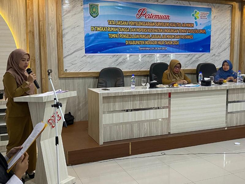 TEMBILAHAN, LIPO - Dinas Kesehatan (Dinkes) Kabupaten Indragiri Hilir (Inhil) menggelar pertemuan tatalaksana penyelenggaraan surveilans kualitas air minum di tingkat rumah tangga dan inspeksi kesehatan lingkungan tempat fasilitas umum, tempat pengelolaan pangan, sarana air minum dan Fasilitas Layanan Kesehatan (Fasyankes), Senin 24 Juni 2024.