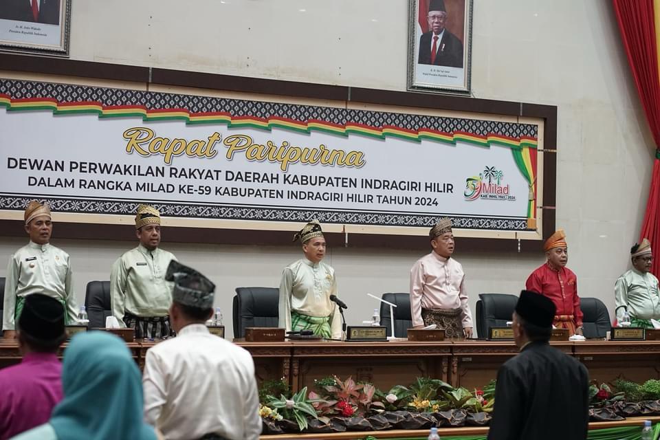 TEMBILAHAN, LIPO - Dewan Perwakilan Rakyat Daerah (DPRD) menggelar Rapat Paripurna dalam rangka Milad ke-59 Kabupaten Indragiri Hilir (Inhil) di aula Gedung DPRD Inhil, Jalan Soebrantas Tembilahan, Jum'at (14/06/2024).