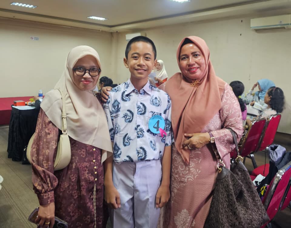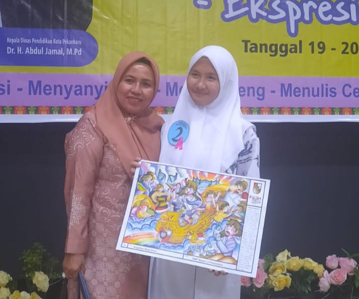Siswa peraih juara 1 bidang ilustrasi bersama Kepsek SMPn 4 Pekanbaru Dr Rukiah, M.Pd.