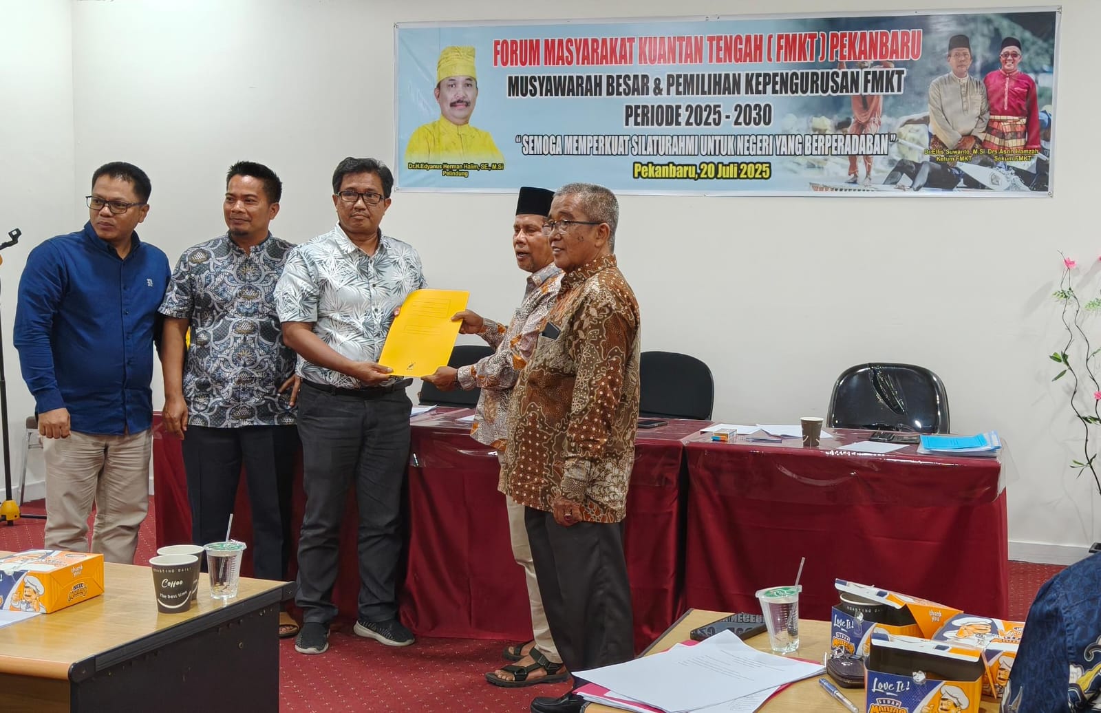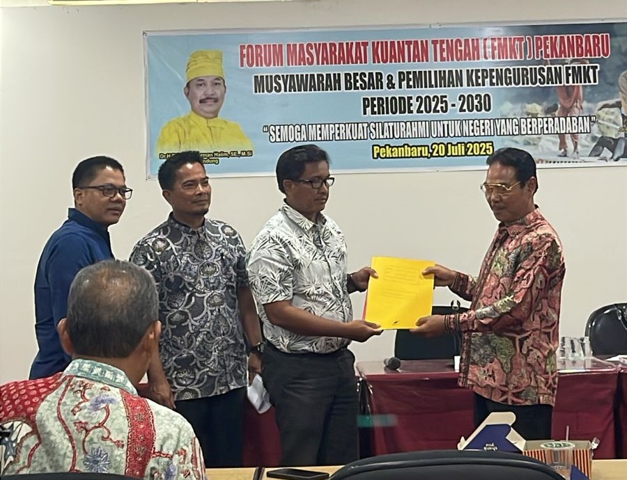 PEKANBARU, LIPO - H Syamsul Anwar, SH, MH terpilih sebagai Ketua Umum Forum Masyarakat Kuantan Tengah (FMKT) Pekanbaru periode 2025-2025 dalam Musyawarah Besar (Mubes) FMKT Pekanbaru, Ahad (20/07/2025) di Wisma Jalur, Jalan Punai Kecamatan Bukit Raya Kota Pekanbaru.