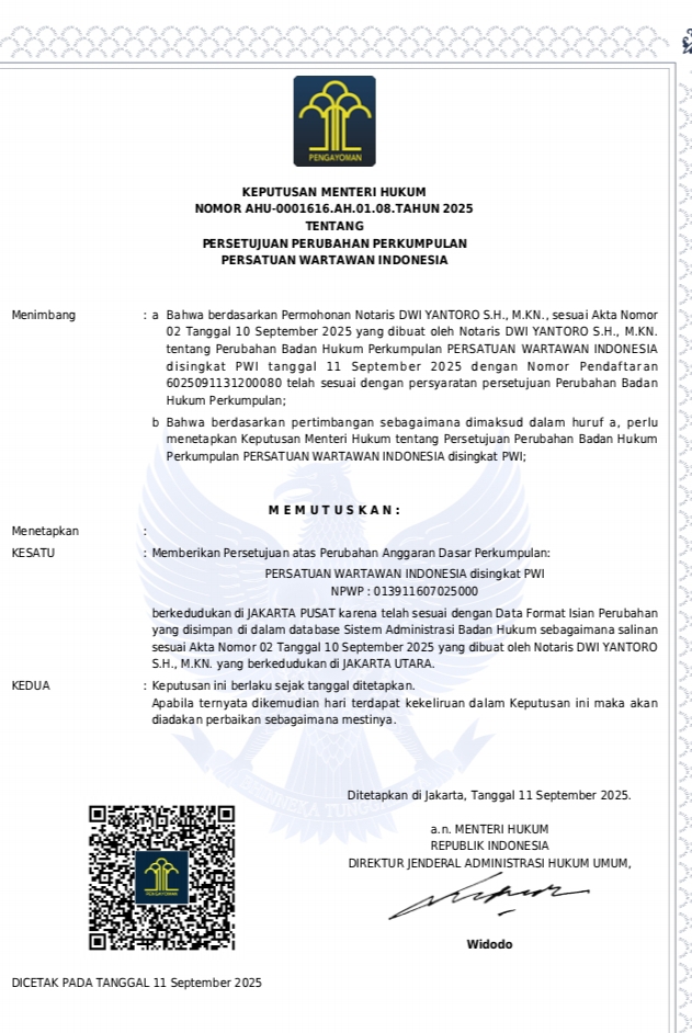 JAKARTA, LIPO - Organisasi Persatuan Wartawan Indonesia (PWI) resmi kembali terdaftar di Kementerian Hukum (Kemenkum) RI dengan Nomor AHU-0001616.AH.01.08. Tahun 2025.
