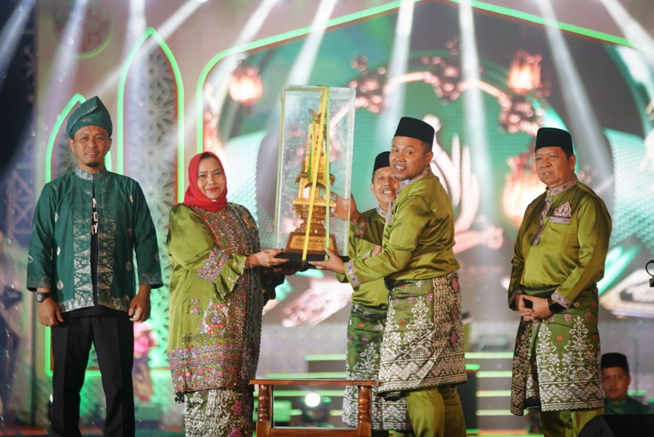 Gubernur Riau Abdul Wahid menyerahkan piala bergilir MTQ Provinsi Riau kepada Bupati Bengkalis, Kasmarni.