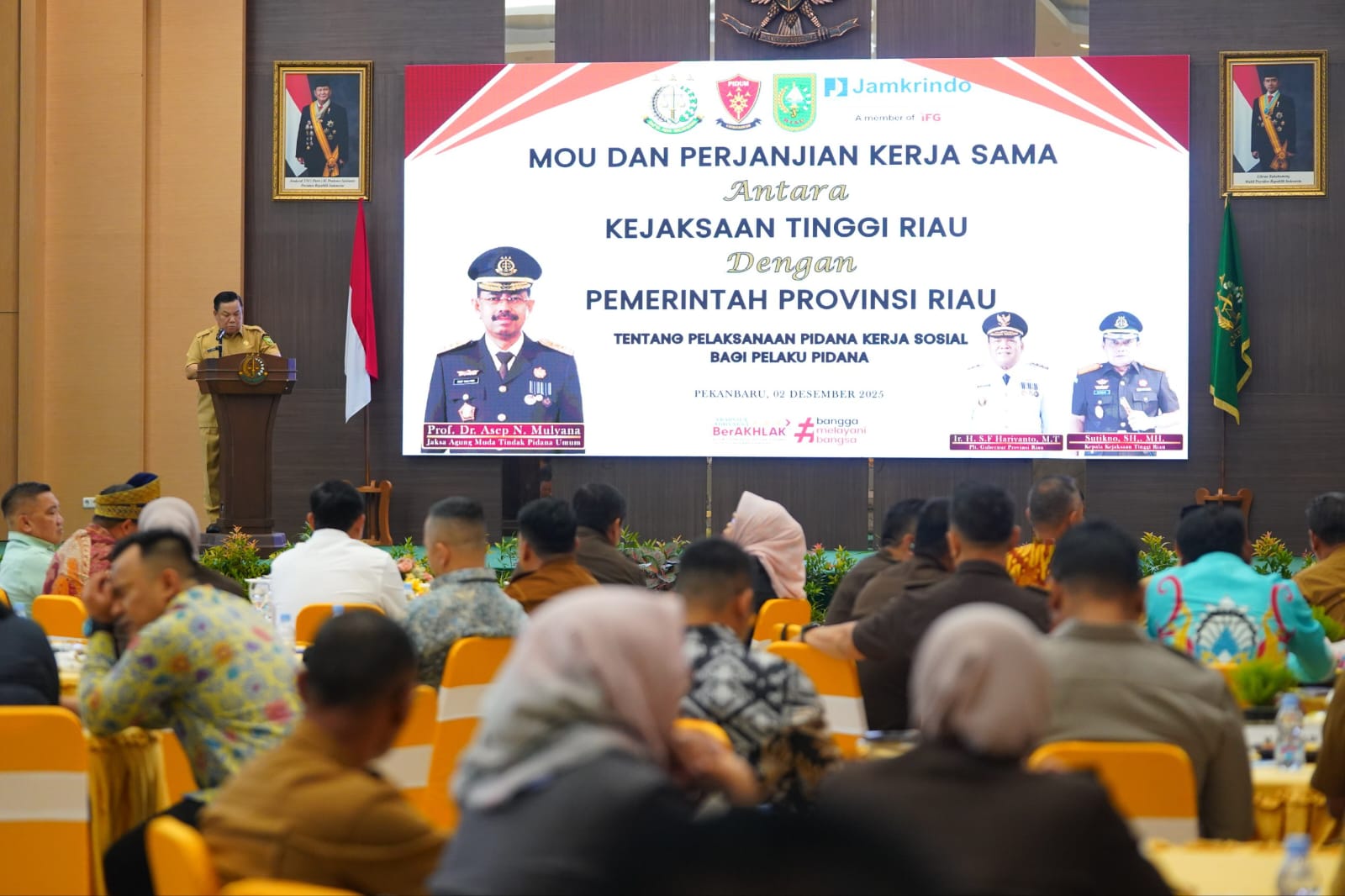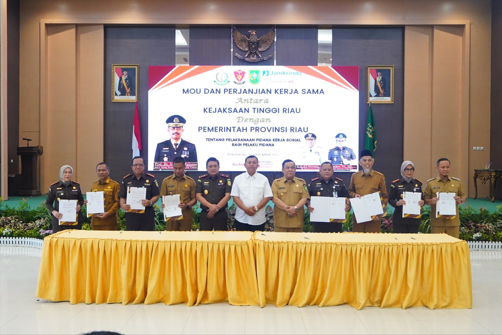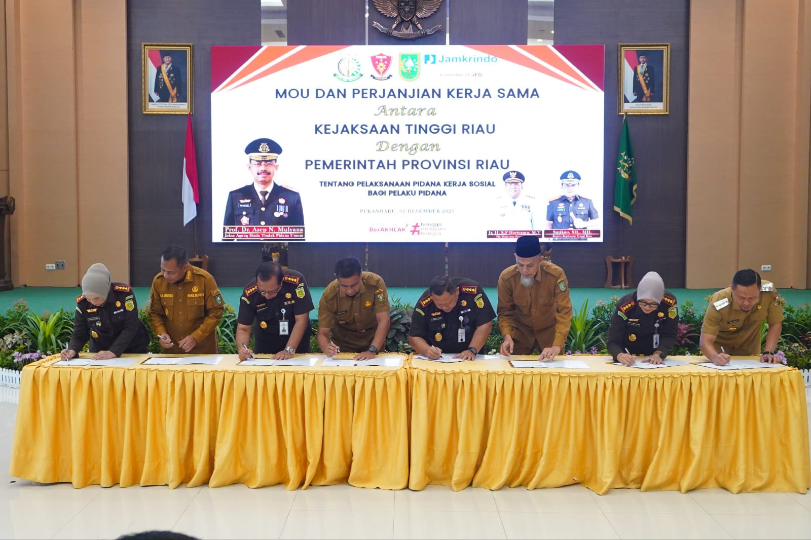 Kegiatan penandatanganan MoU berlangsung di Aula lantai 3 Gedung Satya Adhi Wicaksana, Kejati Riau, Kota Pekanbaru, Selasa (2/12/2025).