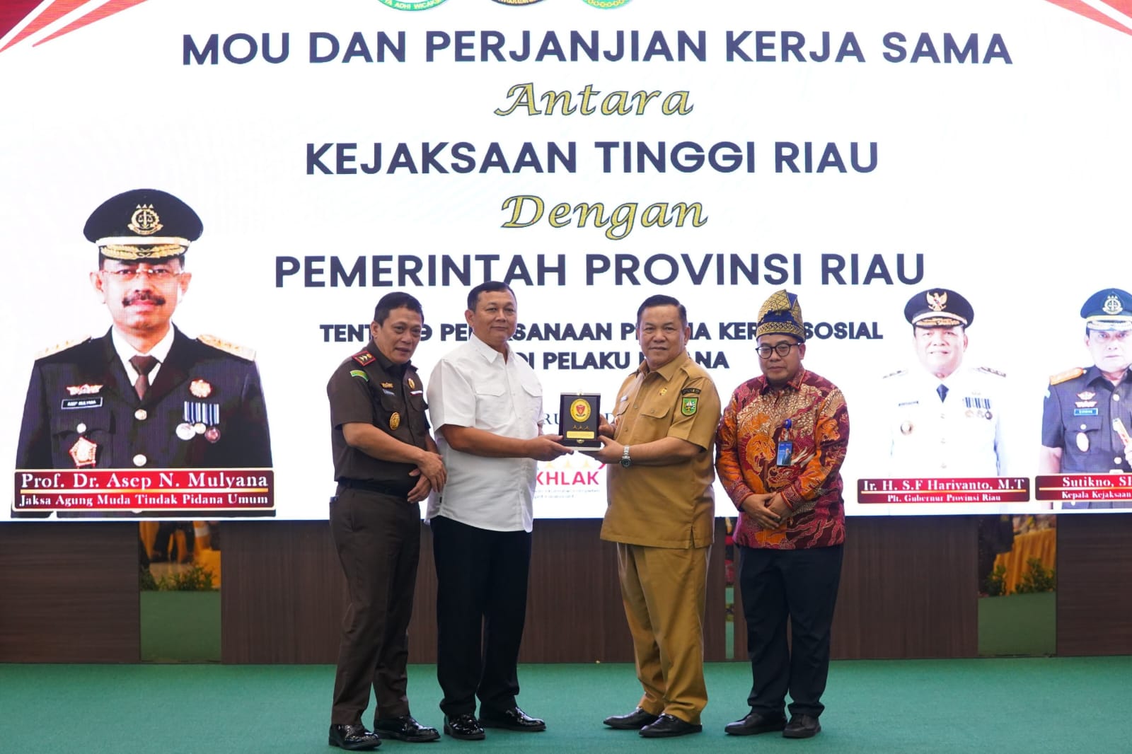 PEKANBARU, LIPO - Pemerintah Provinsi Riau bersama Kejaksaan Tinggi Riau resmi menandatangani Nota Kesepahaman terkait pelaksanaan pidana kerja sosial bagi pelaku tindak pidana ringan. MoU antara Kejaksaan Negeri dan Pemerintah Kabupaten/Kota se-Provinsi Riau juga digelar sebagai langkah teknis dalam mendukung implementasi kebijakan.